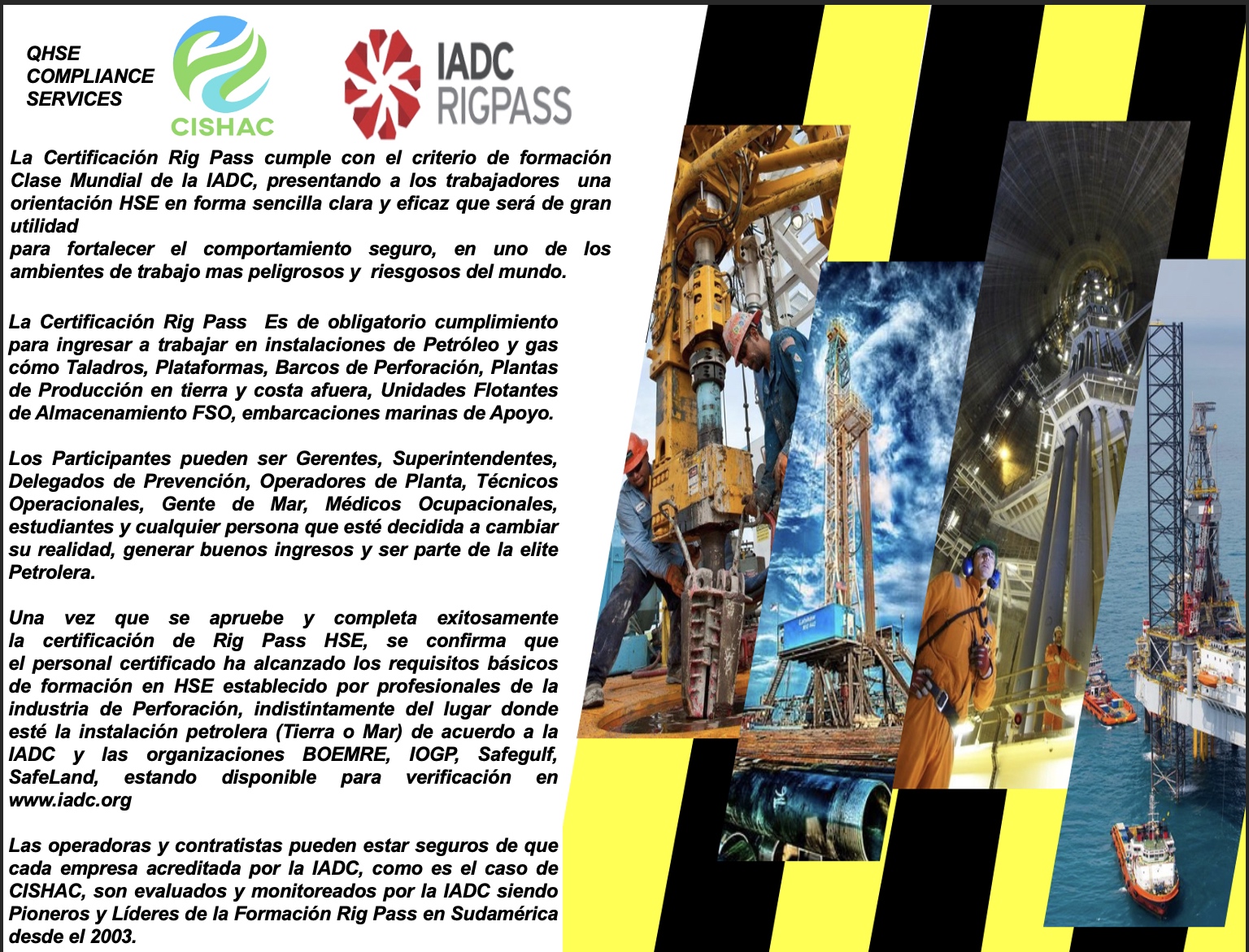 Las operadoras y contratistas pueden estar seguros de que cada empresa acreditada por la IADC, como es el caso de CISHAC, son evaluados y monitoreados por la IADC siendo Pioneros y Líderes de la Formación Rig Pass en Sudamérica desde el 2003.